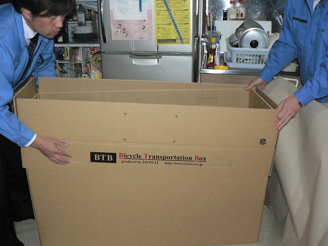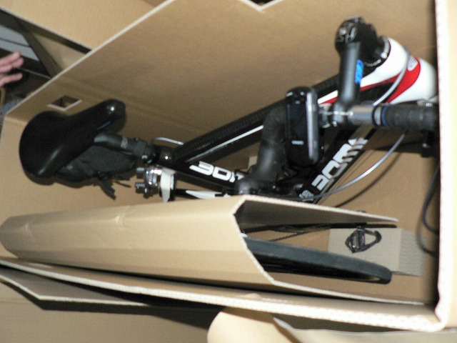 | んで、その箱は、こんなところに入るのです。スッポシ。この箱が自転車の入っている場所を固定する役目も果たします。 | さらに、無駄がないのがコーワの輪行箱!何とダンボールの梱包に使っていた紙も緩衝材として使用できるのです! |