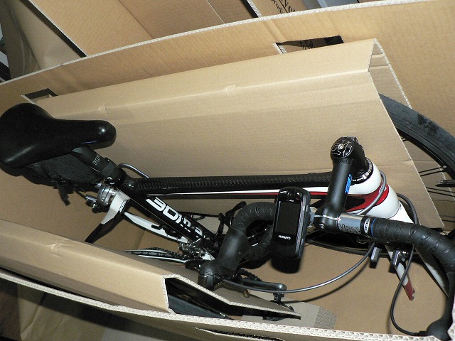 | ダンボールにはさんだら、車輪を自転車の横側の隙間へ入れましょう。 | も1つの車輪も入れましょう。コレでリアとフロントの両方が入りました。なお、自転車本体のリアメカは外しておいたほうがいいかもです。 |