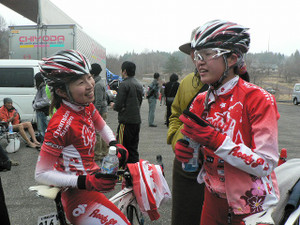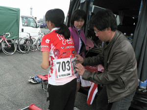 RGJチーム事務局です。先日4月28日・29日の2日間、日本一のロードレーサーが決める「全日本選手権ロードレース」が岩手県八幡平の岩手山を周回する特別コースで開催されました。Ready Go JAPANチームからは、女子ジュニアレース・28日(土)に、坂口姉妹、伊藤、寺田の各選手が出場、女子エリートレース・29日(日)に、佐藤、米田、赤塚、土屋の各選手が出場しました。その1日目・土曜日のレースレポートをお送りします。 RGJチームはジュニアレースの受付や監督会議などがおこなわれる4月27日(金)から会場入り。その日はあいにくの天候で、曇りのち雨の状況。しかし、RGJチーム所属のジュニア女子選手たちは、岩手から遠い兵庫や愛知から移動してきたので、軽く乗って足を動かしてきます。 この後、受付とライセンスコントロールなのですが女子選手たちは「サドル後退のチェックと申請」を同時に済ませます。どういうものなのか? ※上記のサドル後退の申請については、最新の2012年「競技規則集」の第5章・第16条3に記載されております。 そして、チーム監督は監督会議に出席して、明日のレースについて確認などおこないます。 夜になりまして、待ちに待った夕食!ジュニアだけで4名を有するRGJチーム。さらに選手のご家族も一緒なので賑やかな夕食になります。ワイワイ! 翌朝、28日の土曜日は前日の雨雲のなく良いお天気!朝8時からスタートなので、支度も朝早くからおこないます。 そんなこんなで、あっという間にスタート時間が近づいてきました!急いでスタート地点へ。 聖香選手に続いて、楓華選手が11位に、伊藤選手が14位、寺田選手が16位でゴールし、RGJチームのジュニア選手は全員完走を果たしました!これにより来年の「全日本選手権の出場資格」を自動的に得ることができました。 ジュニア男女表彰式、まずは男子ジュニアの表彰です。 ジュニアレース後には、U23男子のレースがおこなわれておりましたが、RGJジュニア選手たちは遠方からの遠征だったこともあり伊藤家以外は、全員帰路につきました。入れ替わるように、翌日のRGJエリートレース出場の米田和美、赤塚友梨恵、土屋尚子の各選手たちが到着。既に到着していた佐藤咲子選手と、さらに伊藤アンナ選手も一緒にコース試走に出かけていきました。 |
